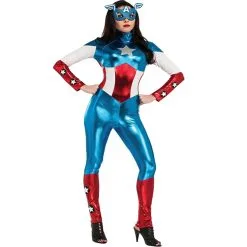 Captain America Dames kostuum bevat de kleuren van de Amerikaanse vlag. Het kostuum bestaat uit een masker en een jumpsuit, dat bestaat uit een prachtige spandex materiaal in de Amerikaanse kleuren. Met dit super hero kostuum is jouw verkleedfeest compleet.