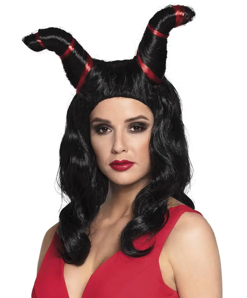 De dames pruik met hoorns is voor de echte duivelse uitstraling van lange zwarte golvende pruik met hoorns van haar.