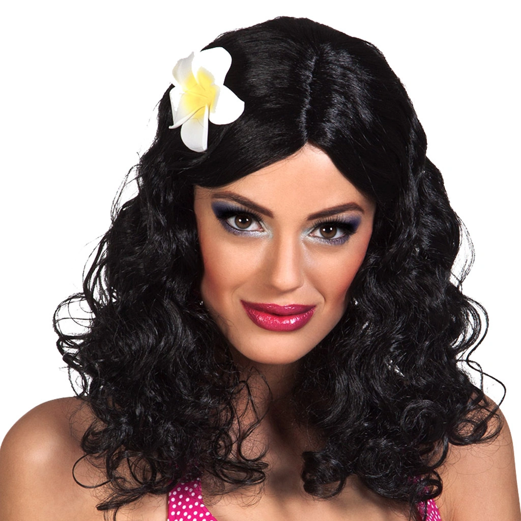 Dames pruik zwart met bloem ook wel hawaii pruik genoemd is een vrolijke pruik met krullen door het witte bloem, Het zwarte golvend haar reikt tot aan de schouders. De dames pruik Leilani is ook bestelbaar in het blond in het bruin.