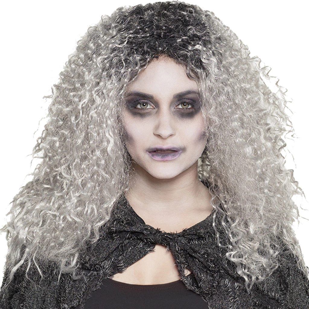 Dames zombie pruik met krullen maak je jouw griezel outfit helemaal af, je kan deze pruik bijvoorbeeld dragen naar het Carnaval, een cosplay, thema feest, Halloween feest, en andere verkleed gelegenheden. Deze Dames Zombie Pruik met Krullen is tweekleurig, zwart en grijs, de pruik is gemaakt van synthetisch haar.
