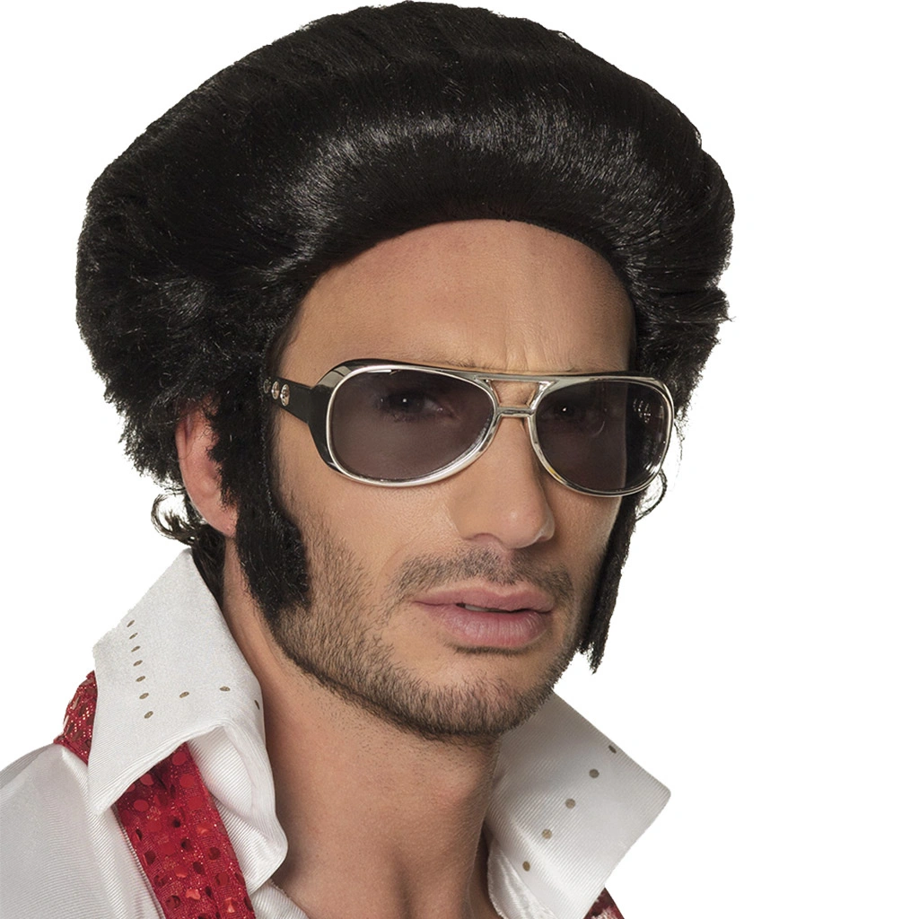Elvis Presley pruik met bakkebaarden de populaire pruik voor rock en roll haardracht voor de jaren 50/ 60 thema feesten en natuurlijk een echt Elvis Presley kostuum. Met deze vetkuif pruik is een goede start gemaakt voor een top vermomming!