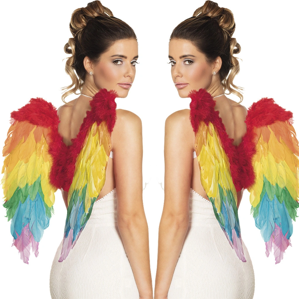 Engelen Vleugel regenboog zijn engelenvleugels van eerste keus geprepareerde vogel veren die zijn geselecteerd en verlijmd op een buigzaam frame. De engelenvleugels zijn gemaakt van vele kleurrijke veren. De geprepareerde vogel veren zijn uitsluitend door rui verkregen.