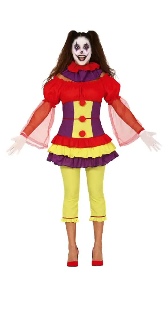 Griezelige IT clown kostuums dames bestaat uit 2 delen en broek en een rokje. De kleuren lijken op het officieel gelicentieerde kostuum uit de film It, de horror mini serie uit 1990 van Stephen King.