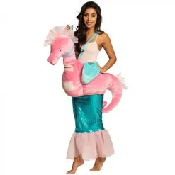 Instap zeepaardje kostuum dames gekocht, versier de kamer met de zeemeermin versiering, dek je tafel met zeemeermin servies en verkleed je zelf in de prachtige aqua kleuren van het zeepaartje kostuum.
