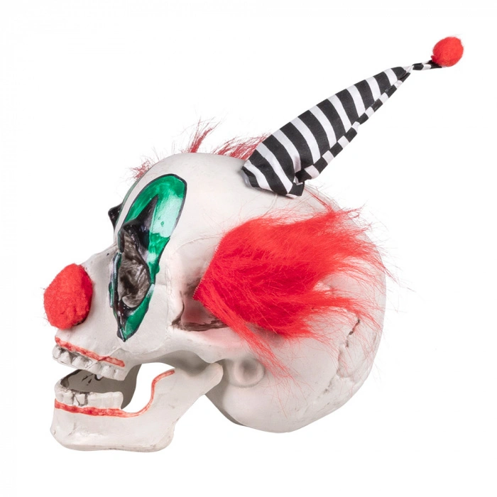 Killer clown decoratie met beweegbare kaak voor als je een griezelig Halloween feest geeft en je een eng tafeldecoratie nodig hebt. De schedel clown heeft een afmeting van 15 x 13 x 18 cm, het is geen speelgoed en is het daarom ook niet geschikt voor kleine kinderen. Maar gebruik het om jouw Halloween feest compleet te maken.