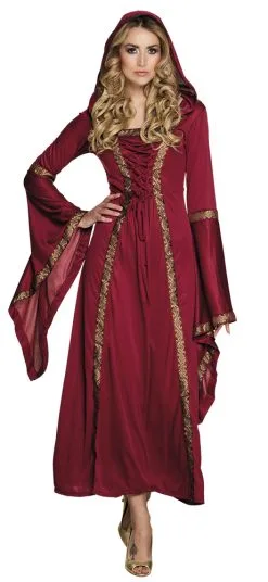 De lange middeleeuwse-jurk-met-capuchon en extra wijd uitlopende mouwen​. Deze dames outfit is beschikbaar in de maten 36/38, 40/42 en 44/46. Combineer onze dames jurk met leuke accessoires voor een unieke look.