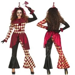 Is de Pierrot Horror clown pak volwassenen in de kleuren bordeaux beige wat voor jou. Dit prachtige Pierrot Horror clown pak meisjes is er in 3 maten S – M en L een mysterieuze verschijning van een top en coltrui en lange broek met een korte pofbroek.