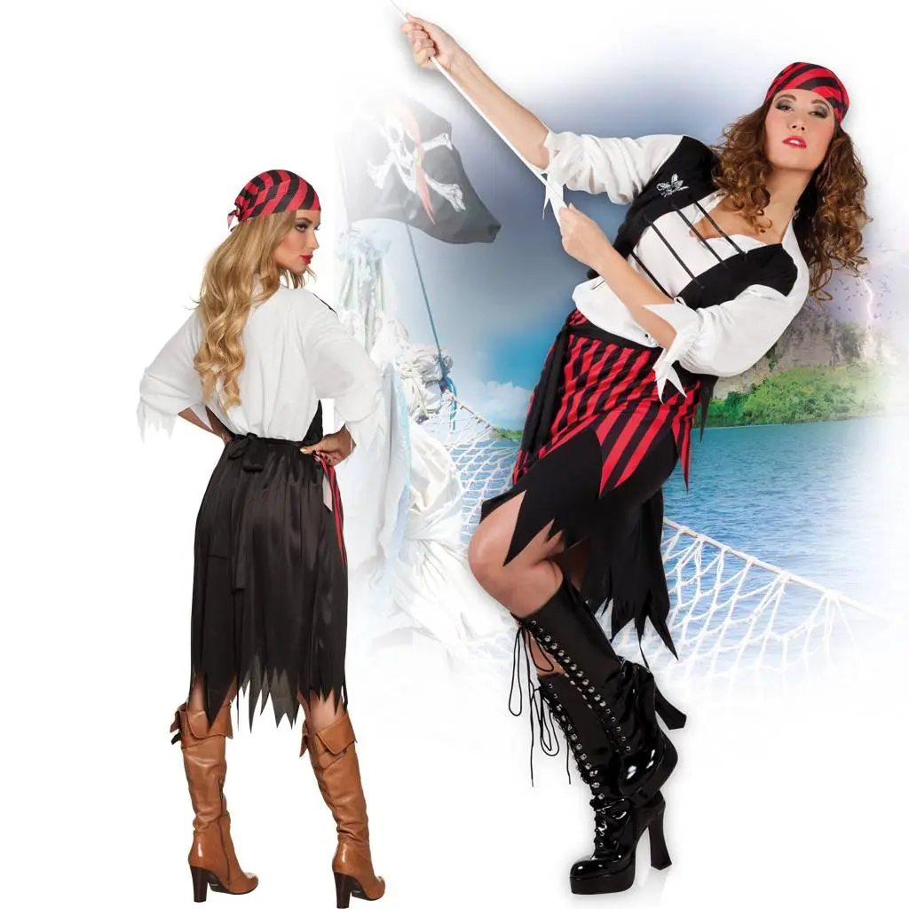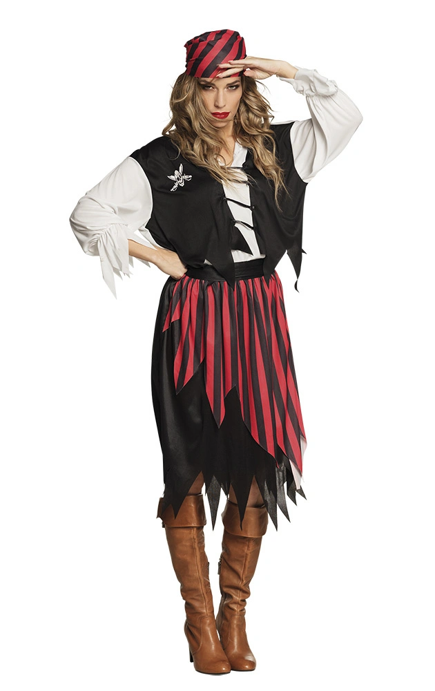 Piraten kleren dames bestaat uit een gestreepte piraten rok met een leuke piraten riem gestreepte rood zwarte bandana, een top met bijpassende vestje. Piraten kleren dames is een van luxe kwaliteit gemaakte dames piraten outfit en is alleen leverbaar in d