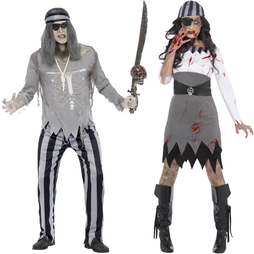 Gratis schmink set bij de, Zombie kostuum dames piraat geest is voorzien van een grijze, gescheurd shirt met een horizontale gestreepte grijze en zwart bijpassende broek, riem hoed, en hoofdband. De voorkant heeft golvende accenten. Bij deĀ Zombie piraat Ghost kun je een piraten pruik en zelfs een piraten zwaard bij bestellen. Zombie kostuum dames piraat geest is er ook in de heren uitvoering. bet deze als duo kleding piraat geest met een leuke korting