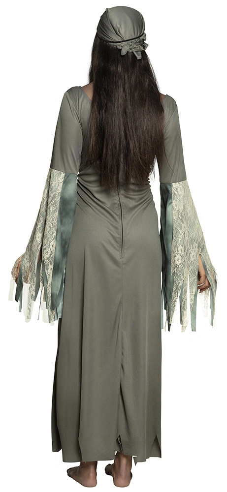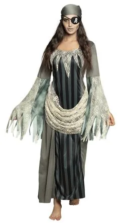 Gratis schmink bij een Zombie pirate kostuum ghost bestaande uit de lange jurk met gestreepte en kanten details en de bandana. De jurk heeft wijde uitlopende mouwen met horror , kanten sierrand en een sjaal riem aan de voorzijde. Het ooglapje maakt het zombie pirate kostuum ghost compleet. leverbaar in 3 maten.