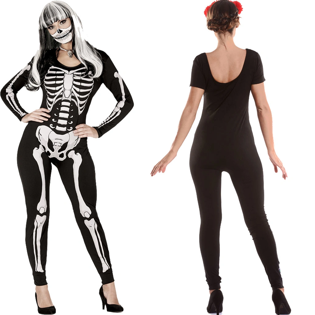 Let wel op de afbeeldingen van de witte botten van zwarte jumpsuit sexy skelet is alleen zichtbaar aan de voorzijde. De achterzijde van dit Zwarte jumpsuit is geheel van zwarte stof.